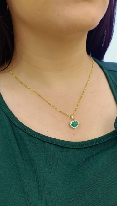 Dije en oro 18k corazon de esmeralda 2.40 ct, diamantes 0.27 ct, peso 2.8 gramos.